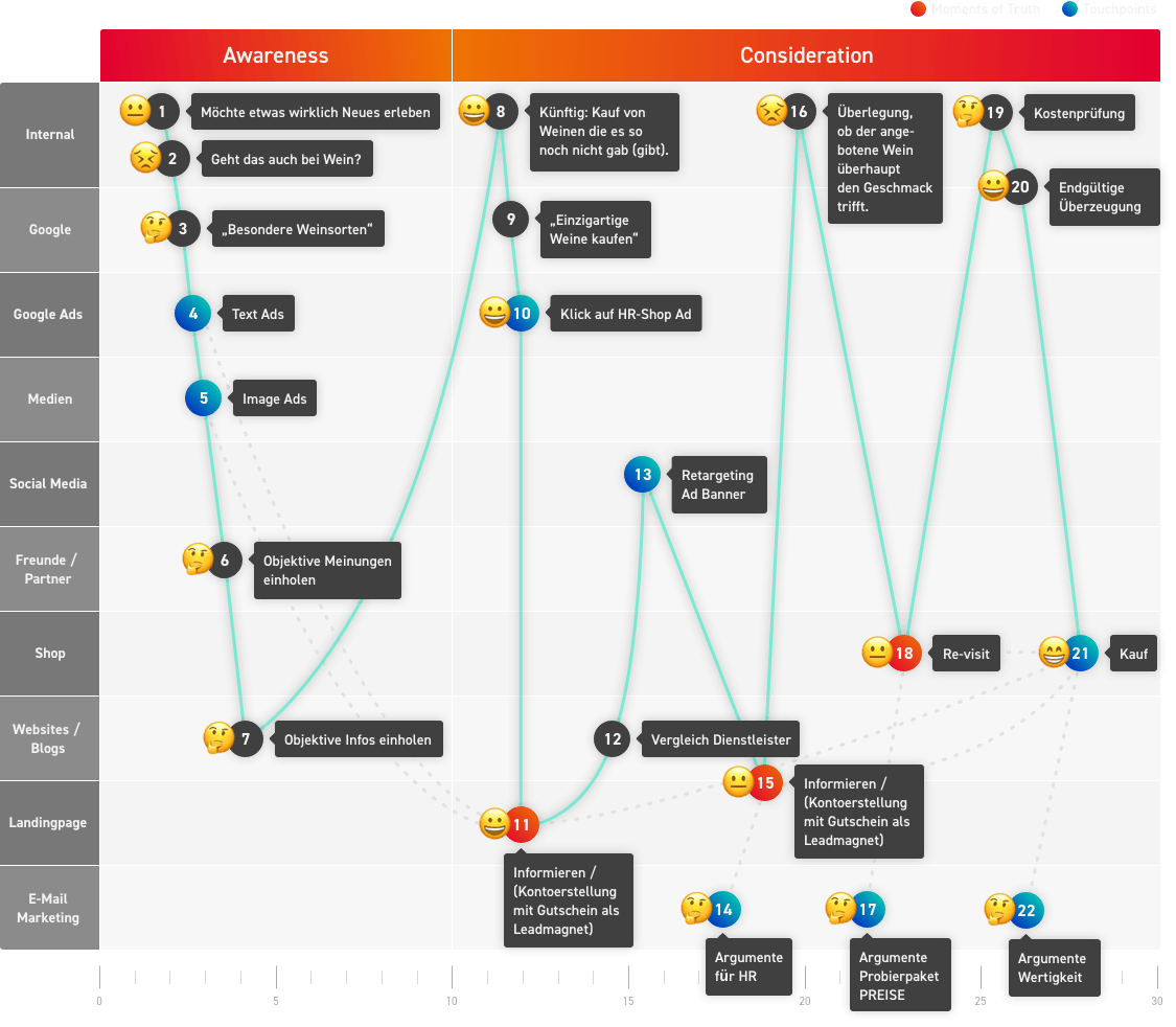 Das vereinfachte Prinzip der Customer Journey wird in einer Customer Journey Map nun detaillierter dargestellt. Bei der Kundengewinnung sind zunächst die Phasen Awareness